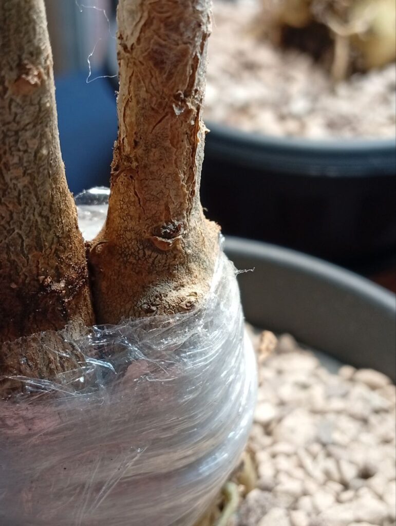 - Пробудження: На безлистому стовбурі прокинулися сплячі бруньки прямо під шаром харчової плівки.