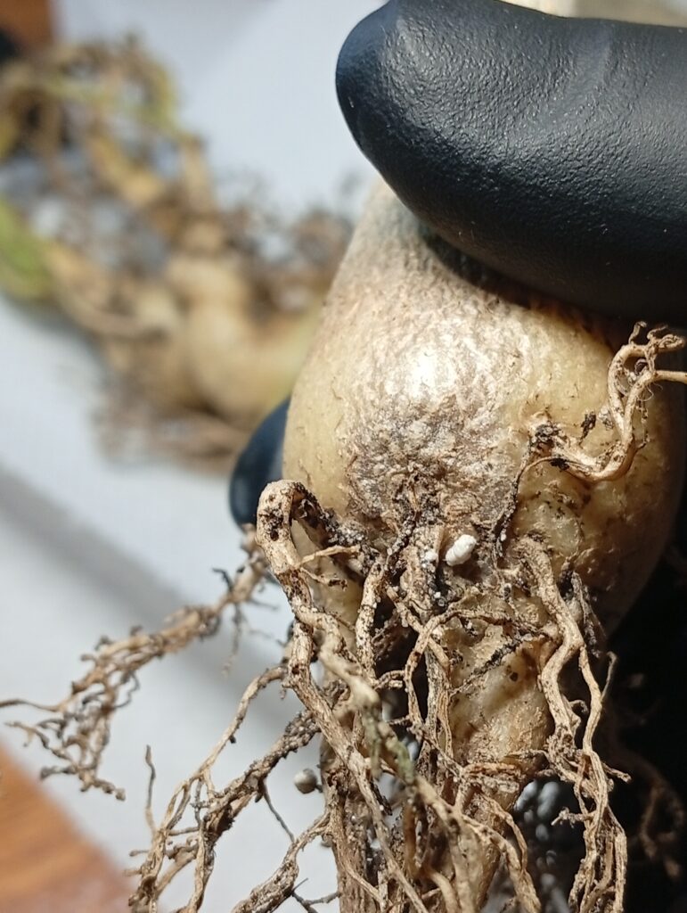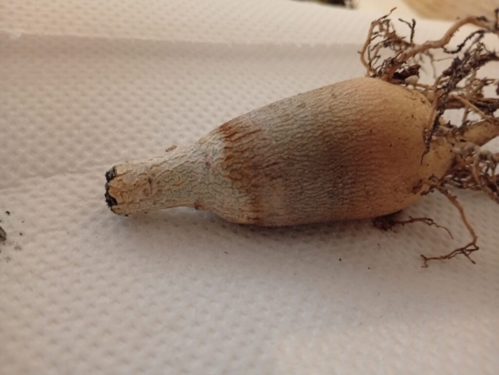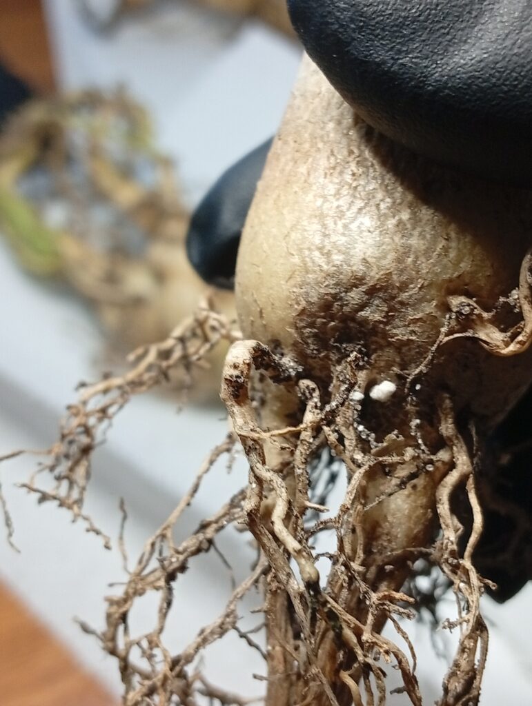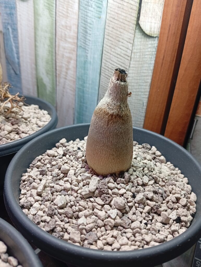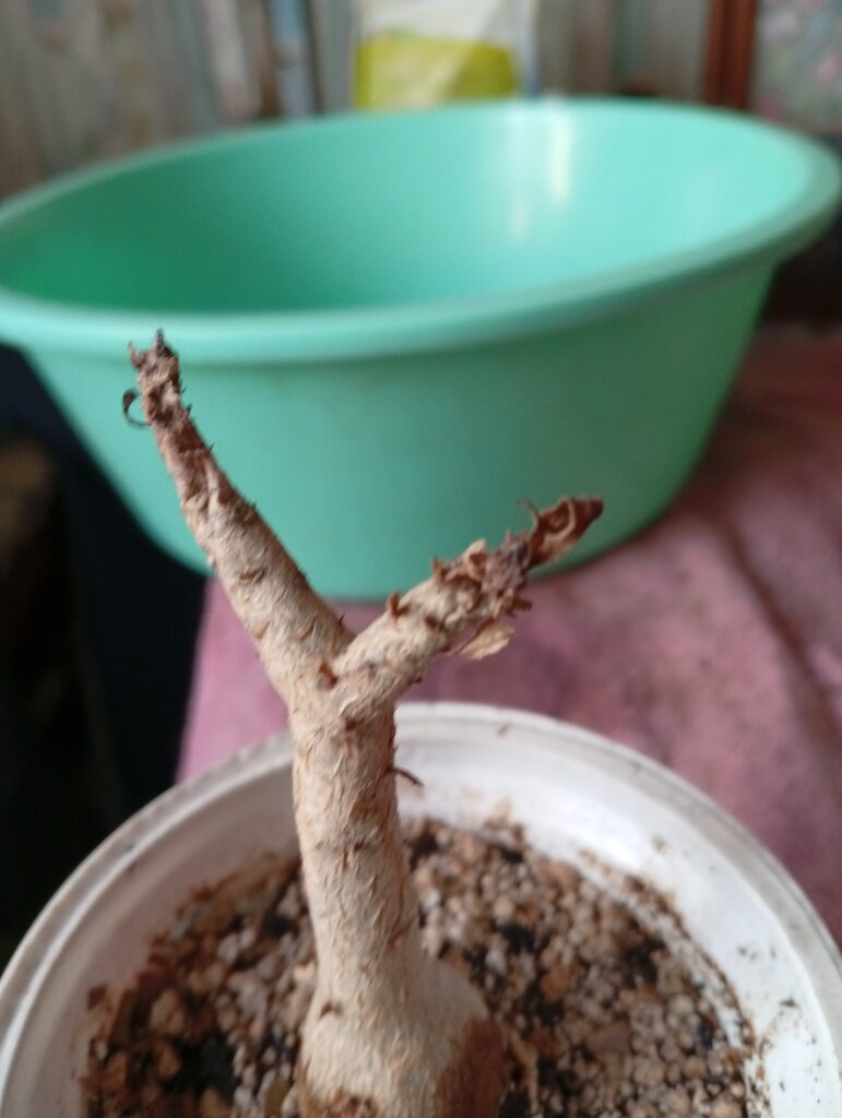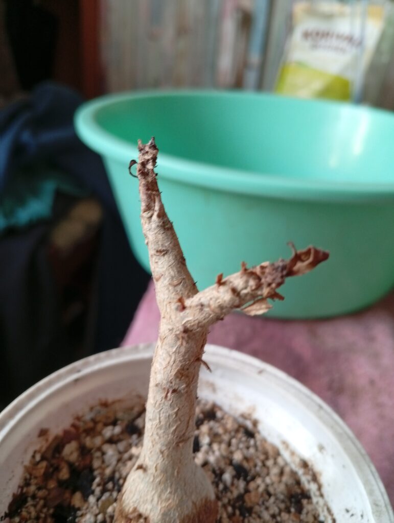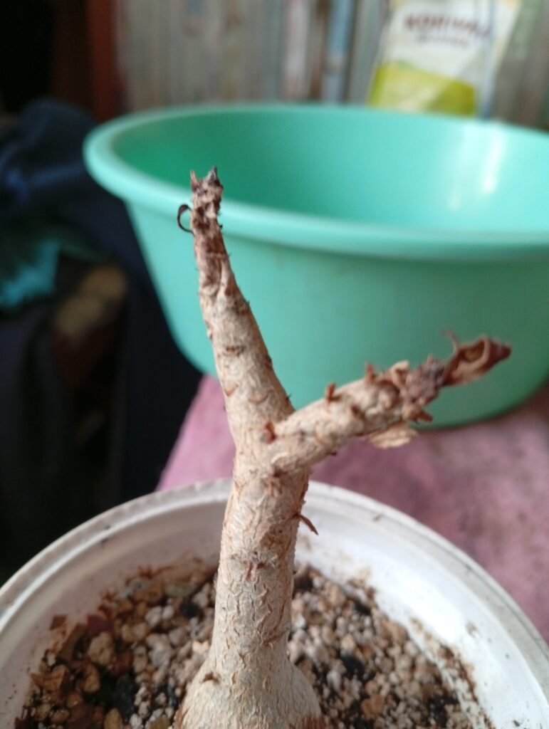 Коли черга дійшла до наступного аденіума, мій піднесений настрій змінився на тривогу. На перший погляд здавалося, що він просто трохи “втомився” від зими — пара пагонів виглядали сухими. “Ну, буває, — подумав я, — просто підсохли кінчики через сухе повітря чи нестачу вологи”. Проте, коли я взяв його в руки, щоб почати пересадку, серце тьохнуло. Ці пагони не просто підсохли — вони мали неприродний вигляд, який аденіумоводу одразу натякає: всередині щось не так. Замість того, щоб просто дістати рослину зі стаканчика, я був змушений взяти в руки ніж. Це вже була не пересадка, а термінова діагностика.