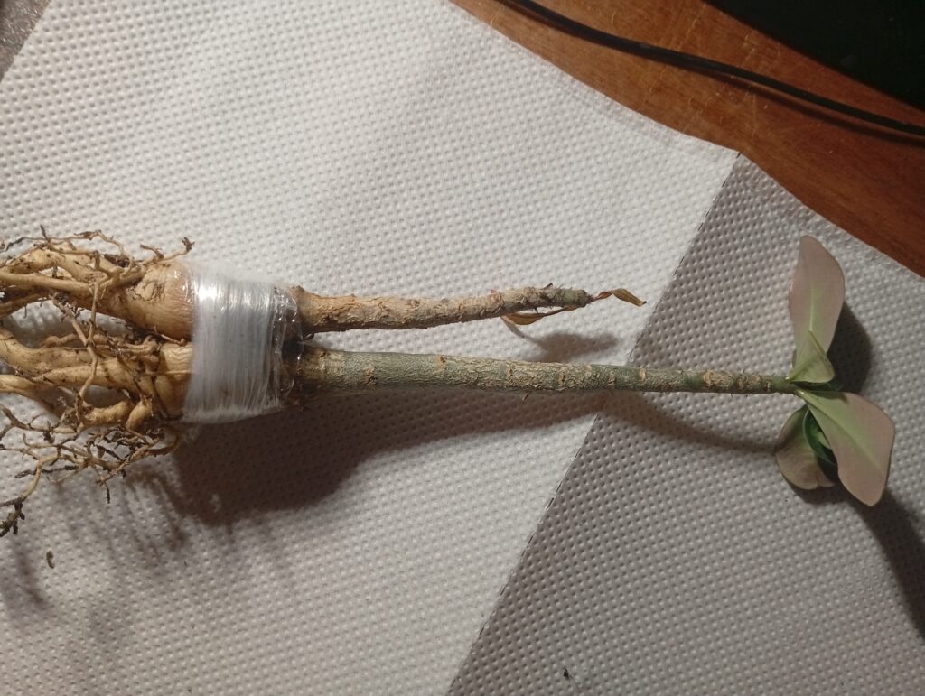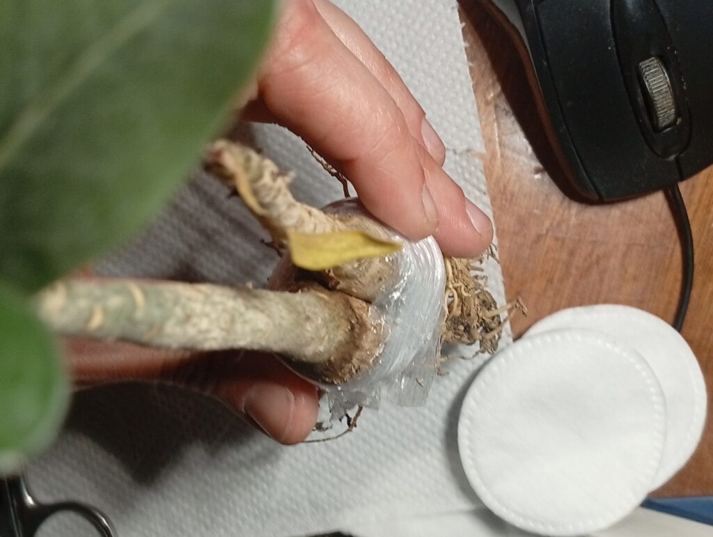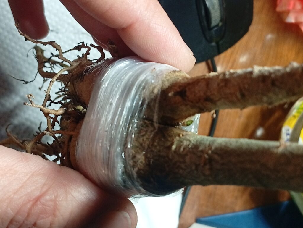 Після того, як зрізи з’єднані, рослини потрібно максимально щільно зафіксувати. Я використав тонку еластичну плівку (харчову плівку), обмотуючи місце з’єднання в кілька шарів. Це не лише тримає конструкцію, а й запобігає пересиханню відкритих тканин. Головне — не перетиснути занадто сильно, щоб не зупинити сокорух, але й не залишити зазорів.