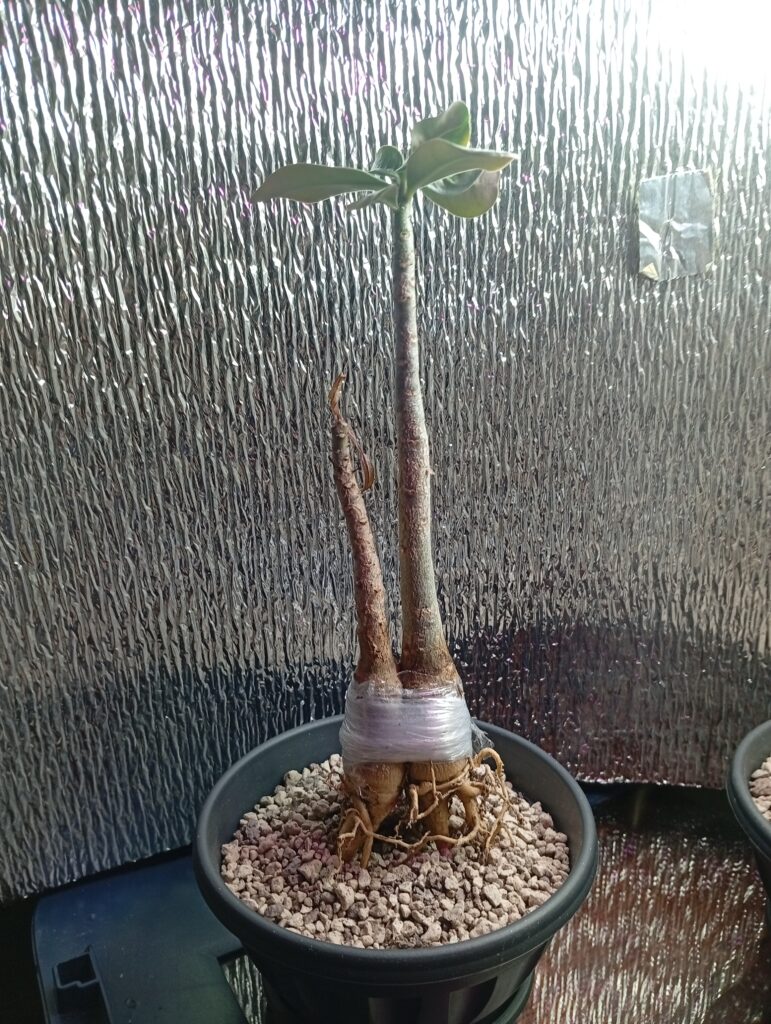 Тепер аденіуми виглядають як одне ціле. Після фіксації рослини висаджуються у легкий субстрат. Тепер залишається лише чекати. Через кілька місяців, коли каудекси почнуть товстішати, вони почнуть тиснути один на одного, що стимулюватиме зростання тканин. У результаті ми отримаємо потужну спільну основу з двома окремими верхівками, що виглядає надзвичайно ефектно.